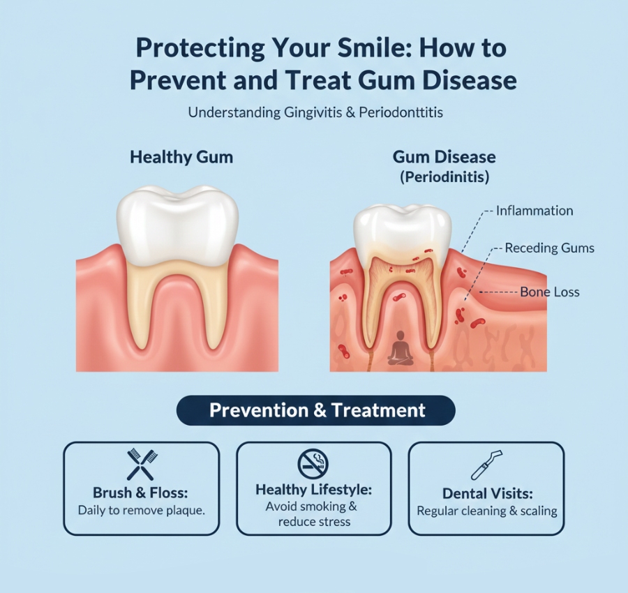 Brushing and flossing are the primary ways to prevent gum disease. Smokers as well as persons exposed to stress risk suffering from gum disease. Consult a dentist if you have gum disease; they may perform scaling and/or root planing.