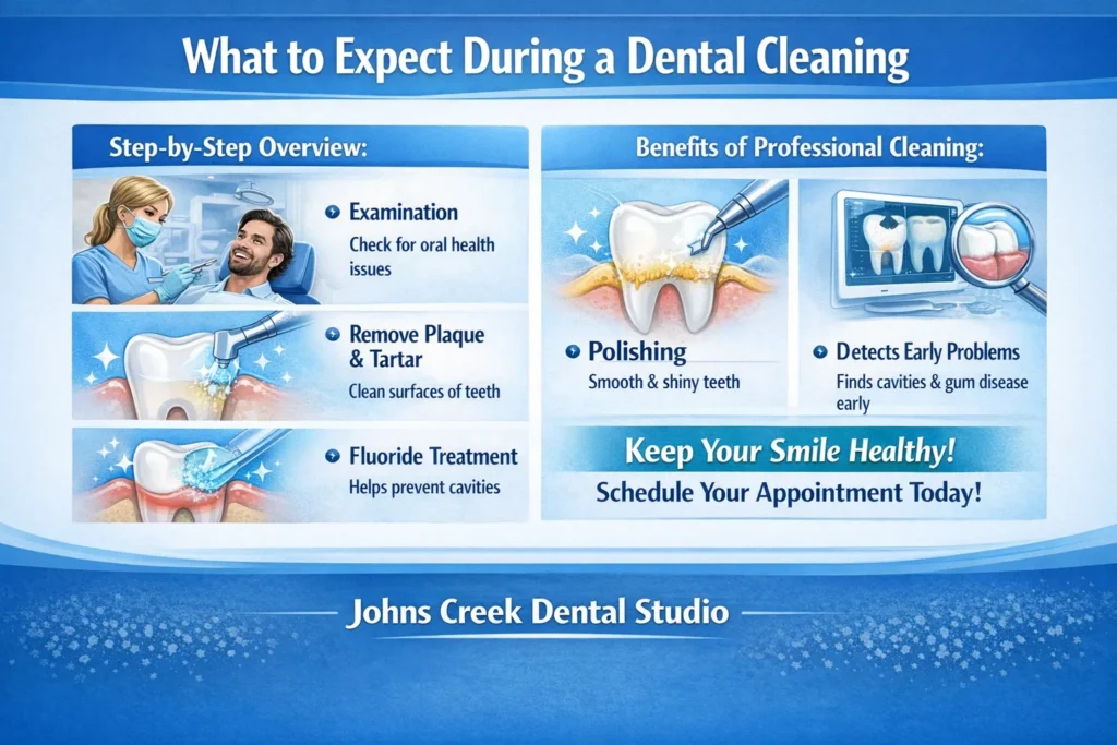 Step-by-Step Overview: When you arrive at Johns Creek Dental Studio, your hygienist will first conduct an exam to check for any signs of oral health issues. Then, they will use specialized tools to gently remove plaque and tartar from the surface of your teeth.
